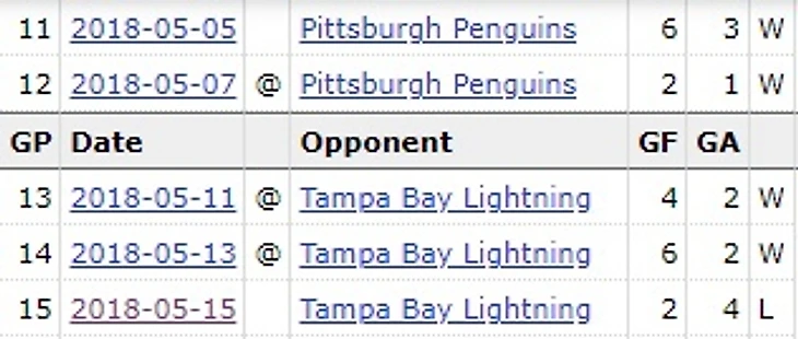 Если не считать серию с Питтсбургом, то в остальных играх второго раунда в составе Кэпс показатели Грина 17, 1+2=3, -5, Сёмина 11, 1+2=3, -3. Результативность ниже плинтуса, полезность опять отрицательная. Без Овечкина у Грина и Сёмина на двоих всего-навсего 5 игр в ПО за 10 сезонов в лиге. Грин сыграл их в 2016 г. за Детройт.