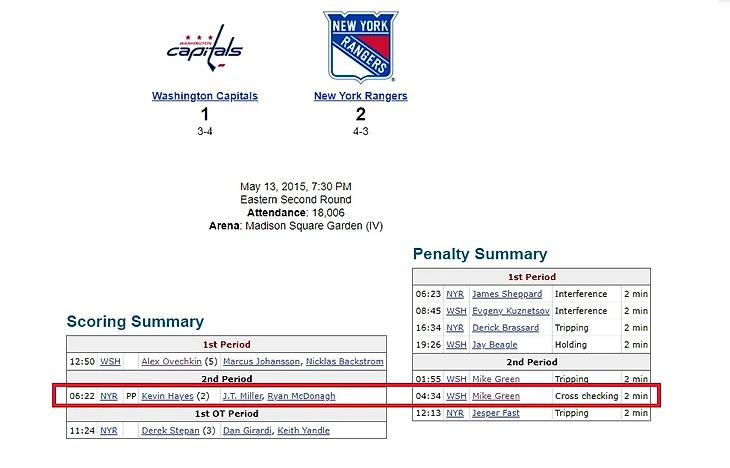 Вообще топить Вашингтон у Грина получалось вплоть до последней игры за клуб. В 7-й игре с Рейнджерс в 2015, к тому времени скатившийся до третьей пары Майк, словил удаление 2+2, второе из которых Рейнджерс реализовал.