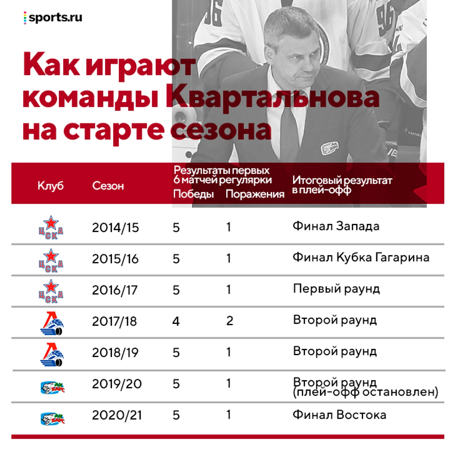 Мы проверили, как Дмитрий Квартальнов начинал на предыдущих местах работы – в таблице мы учли только команды одной весовой категории с «Ак Барсом», но в «Сибири» на старте сезона-2013/14 он выдал 3 поражения в 6 стартовых матчах.