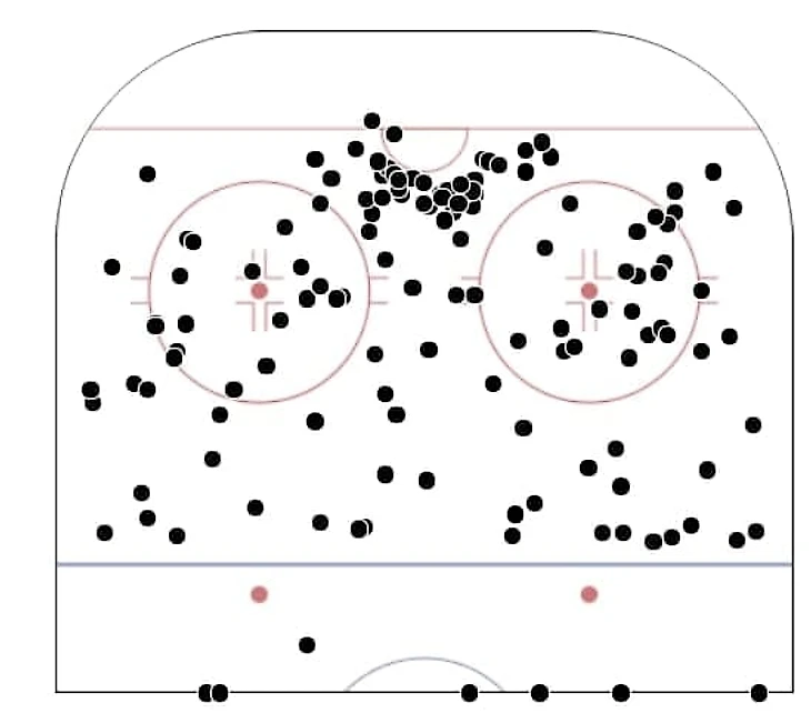 Обратите внимание на зону под воротами – казанцы просто выжигают слот, откуда забивается большая часть голов в современном хоккее. На короткой дистанции у «Ак Барса» едва ли не худшая реализация бросков в лиге – ниже только «Барыс», «Амур» и «Северсталь», но у этих команд проблемы и с созданием моментов.
