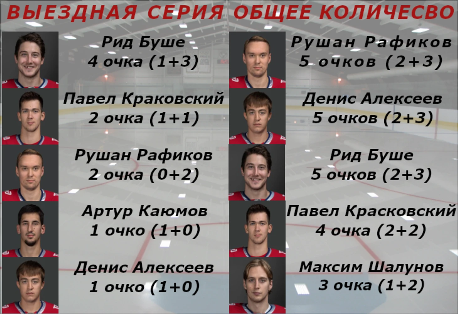 Павел Красковский, игравший на точке чаще остальных в выездной серии(49 раз), имеет процент выигранных вбрасываний - 40,8%. Антон Сагадеев(11 раз) - 63,6%. Конечно, Павел выходит на лед против ведущих звеньев соперников, но цифры говорят сами за себя.