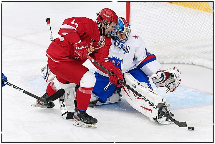 Но по-настоящему Савелий начал выходить на авансцену начиная со второго периода. На площадке продолжились «качели», но уже гости были острее и чаще гостили в зоне «Витязей». Голкипер спасал после бросков Хремкина, Борисова и других. Особенно тяжело обороне и Савелию пришлось в концовке периода, когда гости сначала разыгрывали отложенный штраф, а затем и полноценное большинство.