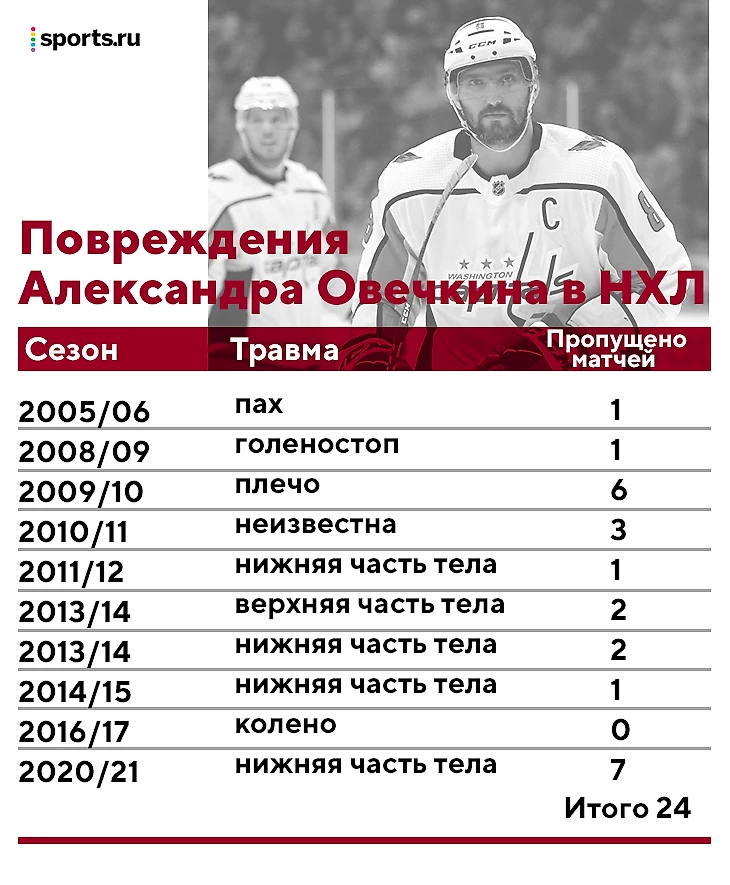 Овечкин может не выйти на лед в первом матче сезона НХЛ. За всю карьеру он пропустил всего 24 матча из-за травм