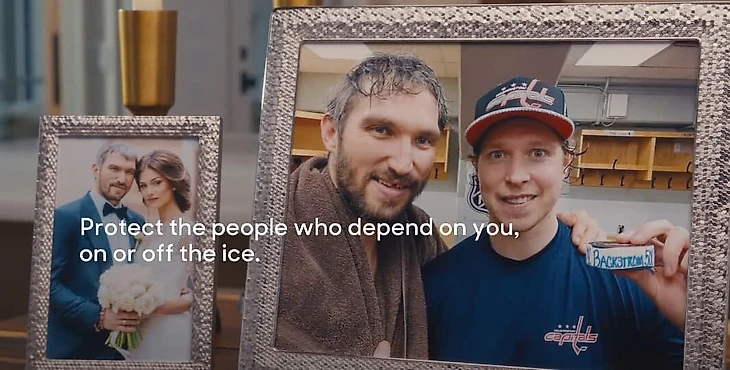 А дальше нам показывают фотографии Овечкина и Бэкстрема со слоганом: «Защитите людей, которые зависят от вас, на льду и вне его».