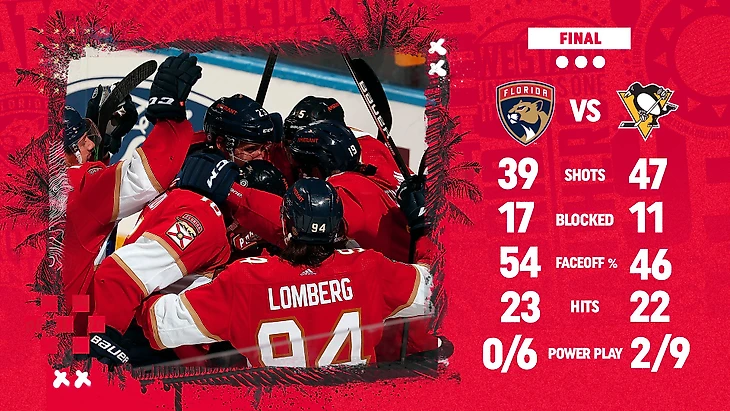 "Флорида Пантерз"-"Питтсбург Пингвингз" 5:4 (ОТ).Картер Верхаг в овертайме принёс победу хозяевам.Картер Верхаг и Аарон Экблад забросили по 2 шайбы,Александр Барков отдал 2 результативные передачи,Сергей Бобровский отразил 43 броска.У гостей Джефф Картер набрал 2 очка (1+1),Крис Летанг отдал 2 результативные передачи.