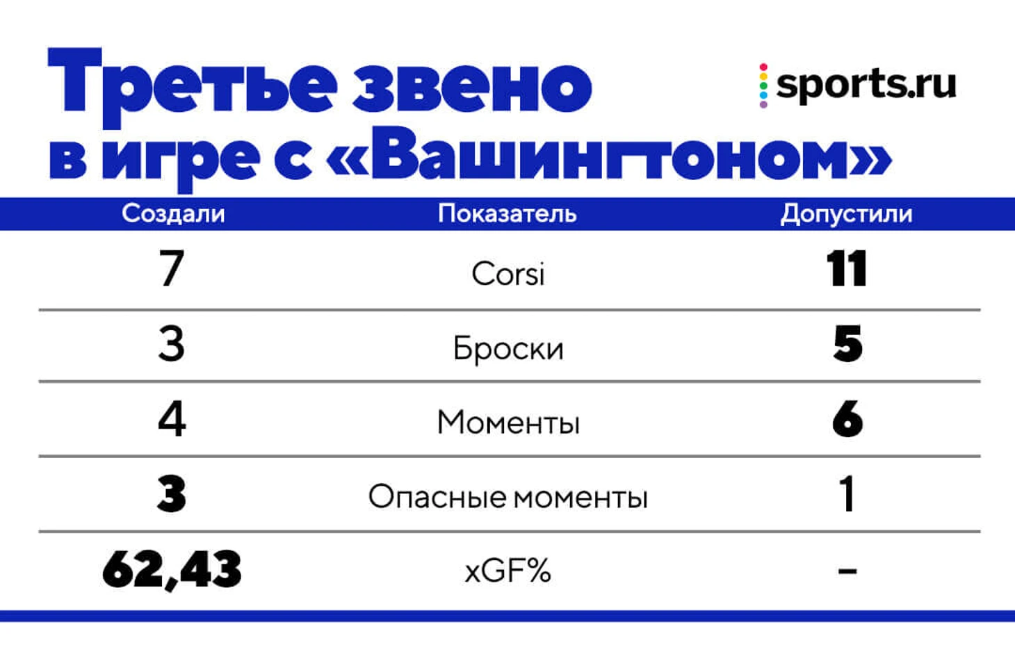 Овечкин забил дважды: первый гол – тройке Стэмкос – Пойнт – Сирелли (собрались по ситуации), второй как раз звену Колтона, но его судьи отменили, потому что шайба не пересекла линию до конца. По более содержательным цифрам: если верить сайту Natural Stat Trick, тройка немного проиграла все существенные показали – броски, броски в створ и моменты, но при этом создала больше, чем допустила опасных моментов. И в итоге наработала приличный xGF% - заметно больше половины.