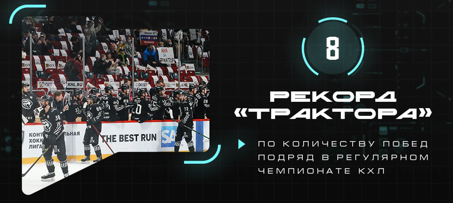 «Трактор» в сезоне 2021/2022 побил рекорд по количеству выигранных матчей подряд в регулярном чемпионате. Сейчас достижение команды Анвара Гатиятулина составляет восемь побед кряду. На этой дистанции «черно-белые» обыграли «Авангард», «Йокерит», дважды «Амур» и «Адмирал», ХК «Сочи» и московское «Динамо». Предыдущий рекорд, равнявшийся семи матчам без поражений, принадлежит также команде Анвара Гатиятулина сезона 2017/2018. 2017/2018 I 7 матчей 11 января – 1 марта vs «Слован» – 3:0 / Братислава vs «Югра» – 4:0 / Ханты-Мансийск vs «Авангард» – 2:1 / Омск vs «Югра» – 2:1 / Челябинск vs «Авангард» – 3:1 / Челябинск vs «Автомобилист» – 3:1 / Екатеринбург vs «Сибирь» – 4:1 / Новосибирск Также отметки в семь побед подряд с «Трактором» добивался Валерий Белоусов в «регулярке» 2011/2012. 2011/2012 I 7 матчей 27 сентября – 14 октября vs «Торпедо» – 5:2 / Нижний Новгород vs «Авангард» – 2:0 / Челябинск vs «Барыс» – 4:3 / Челябинск vs «Металлург» Магнитогорск – 5:1 / Челябинск vs «Нефтехимик» – 4:1 / Челябинск vs «Ак Барс» – 2:1 / Казань vs «Динамо» Москва – 2:0 / Москва