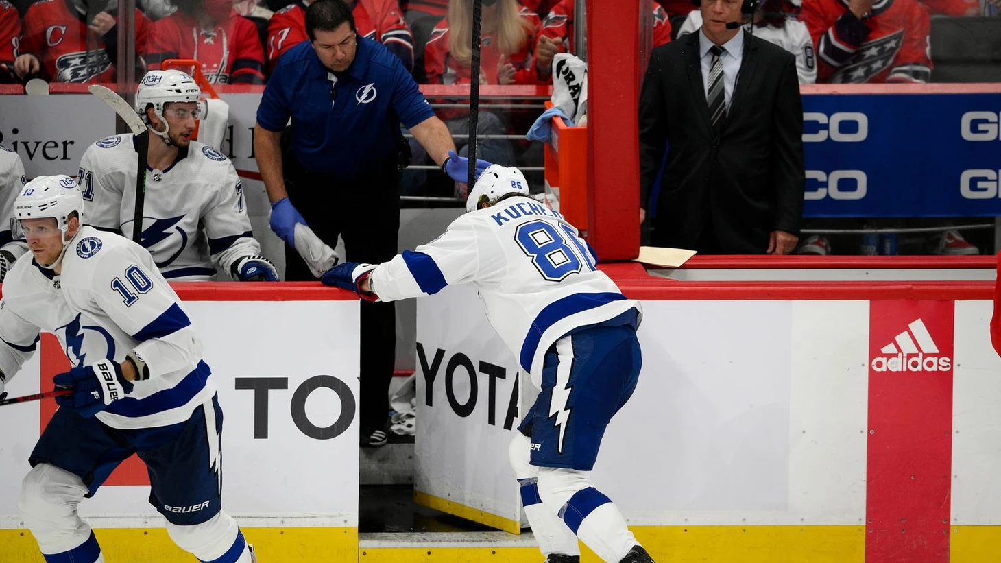 Посидев пару минут на скамейке под присмотром суетящегося рядом Тома Маллигана, Кучеров с его помощью медленно отправился в раздевалку Тампы и больше не возвратился на лед.
