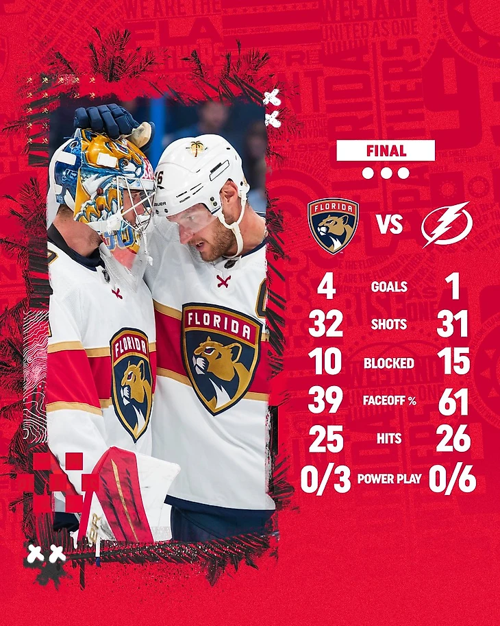 "Тампа-Бэй Лайтнинг"-"Флорида Пантерз" 1:4.Антон Лунделл и Александр Барков набрали по 2 очка (1+1),Сэм Райнхарт отдал 2 результативные передачи,Спенсер Найт отразил 30 бросков.
