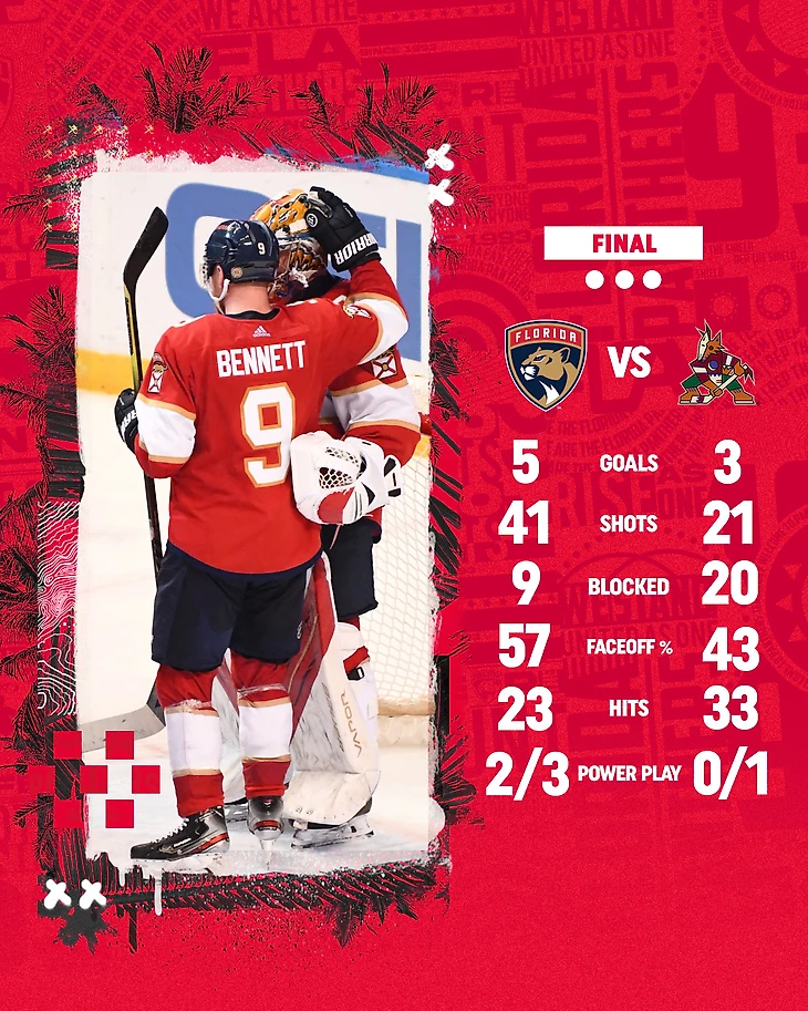 "Флорида Пантерз"-"Аризона Койотс" 5:3.Джонатан Юбердо набрал 2 очка (1+1),Сэм Беннетт и Брэндон Монтур отдали по 2 результативные передачи,Спенсер Найт отразил 18 бросков.У гостей Илья Любушкин отдал результативную передачу.Во втором периоде Радко Гудас подрался с Райаном Дзингелом."Пантеры" выиграли 6 игру подряд.