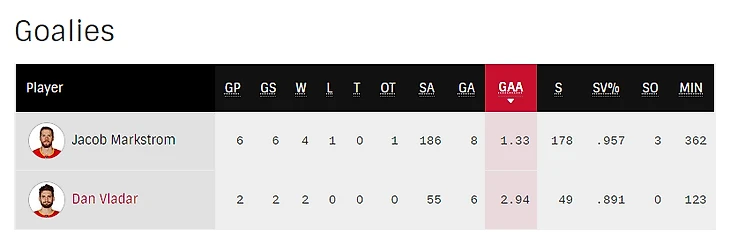 Пройдемся по персоналиям. Первый, во всех смыслах, Якоб Маркстрём: 6 матчей, 4 победы, 3 шотаута. У его дублера Дана Владаржа всего 2 игры в активе, но зато он пока не знает поражений. У шведа 178 сейвов (коэффициент надежности 0,957%), у чеха 49 (0,891%).