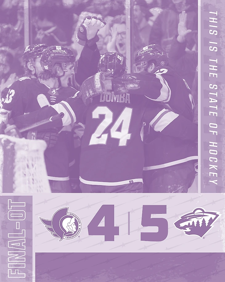 "Миннесота Уайлд"-"Оттава Сенаторз" 5:4 (ОТ).Кирилл Капризов в овертайме забросил победную шайбу.Кирилл Капризов набрал 2 очка (1+1),Маркус Фолиньо забросил 2 шайбы,Кевин Фиала отдал 2 результативные передачи,Дмитрий Куликов отдал результативную передачу,Кэм Тальбо отразил 24 броска.У гостей Джош Норрис и Дрэйк Батерсон набрали по 2 очка (1+1),Майкл Дель Зотто отдал 2 результативные передачи.В первом периоде Брендон Дюхейм подрался с Остином Уотсоном.