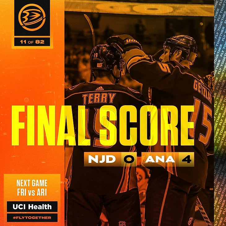 "Анахайм Дакс"-"Нью-Джерси Дэвилз" 4:0.Райан Гецлаф набрал 3 очка (1+Аллле2),Трой Терри забросил 2 шайбы,Джон Гибсон отразил 28 бросков и сыграл первую сухую игру в сезоне.