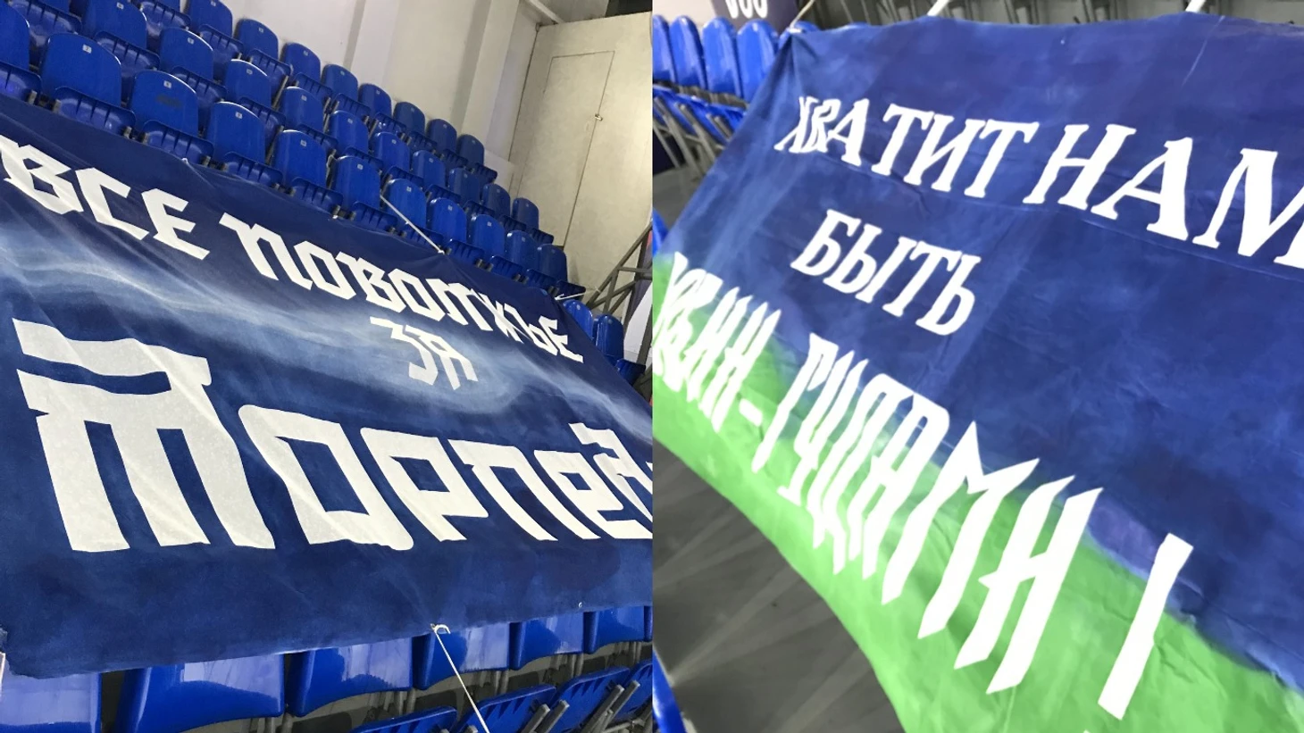 Чтобы команда не подумала, что они совсем остались без поддержки на фанатском секторе закрепили два баннера с громкими лозунгами