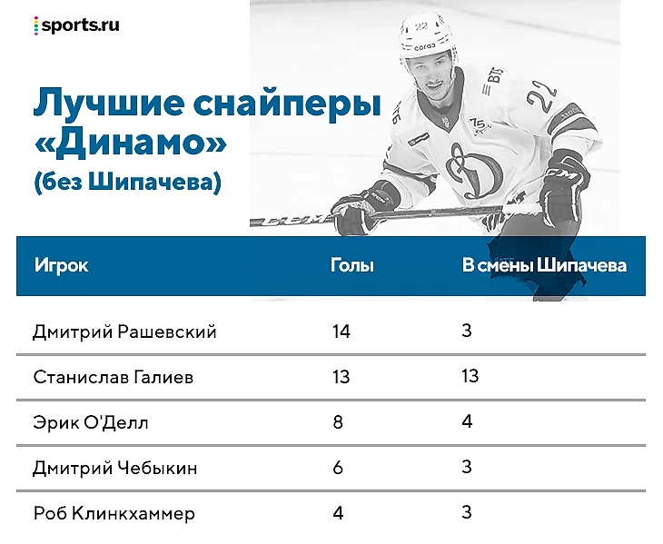 К остальным – большие вопросы. Если убрать Галиева от Шипачева, он рискует откатиться на цифры Даниила Тарасова, который страдает в «Ак Барсе» без топового плеймейкера (2+1 в 19 играх). Галиев повыше уровнем, но что он покажет в «Динамо» без Шипачева в центре – загадка. Вот и получается, что вся атака сосредоточена на двух креативных игроках – Шипачев и Рашевский буквально тянут команду на себе.