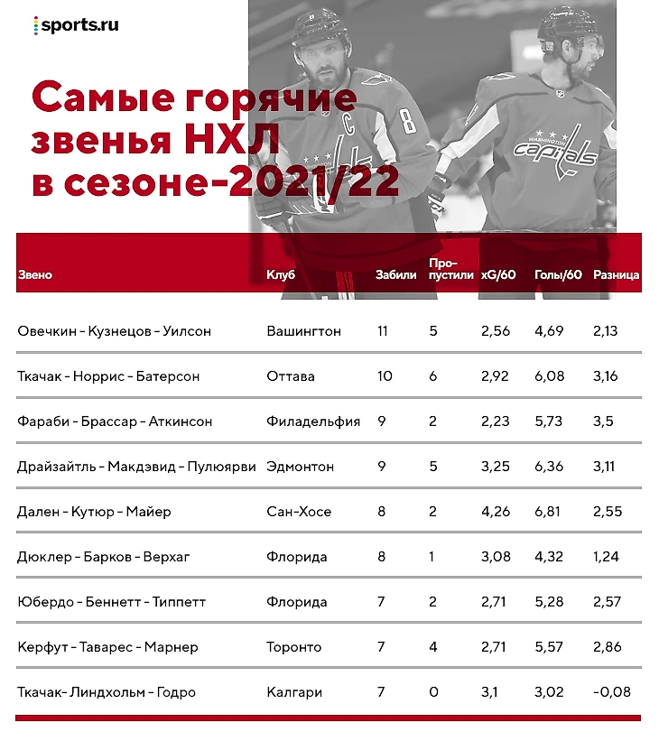 Итак, что видим – тройка Кузнецова-Овечкина действительно самая забивная на старте сезона, но всего на один гол отстает дерзкое молодое трио из «Оттавы».