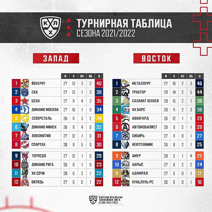 Можно уже смело говорить, что практически 50 % регулярного чемпионата КХЛ позади. Оглянуться не успеете,как уже и плей-офф не за горами. Наша лига всегда славилась интригами, и даже скандалами. От этого никуда не скрыться. А в этом сезоне, интрига будет накалена до предела. Сразу четыре команды Восточной конференции ("Сибирь", "Нефтехимик", "Амур", "Барыс") идут "ноздря в ноздрю" за две заветные и последние путевки в плей-офф, так как ,на мой взгляд, первая "шестерка" команд в плей-офф уже известна. Среди счастливчиков: "Металлург Магнитогорск", "Трактор", "Салават Юлаев", "Ак Барс", "Авангард" и "Автомобилист". Западная конференция славится своей плотностью в турнирной таблице. Расстояние от 3-го до 9-го места составляет шесть очков. Это нам говорит о том, что здесь не все еще понятно и даже "ЦСКА" может опуститься вниз. И если это произойдет, то удивления у меня никакого не будет.