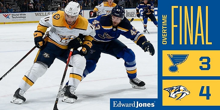 "Сент-Луис Блюз"-"Нэшвилл Предаторз" 3:4 (ОТ).Мэтт Дюшен в овертайме принёс победу гостям.Маркус Гранлунд отдал 4 результативные передачи,Мэтт Дюшен набрал 3 очка (2+1),Люк Кунин набрал 2 очка (1+1),Яков Тренин забросил одну шайбу,Давид Риттих отразил 33 броска.У хозяев Джордан Кайру забросил 2 шайбы,Владимир Тарасенко забросил одну шайбу.В первом периоде Дакота Джошуа подрался с Майклом МакКароном.