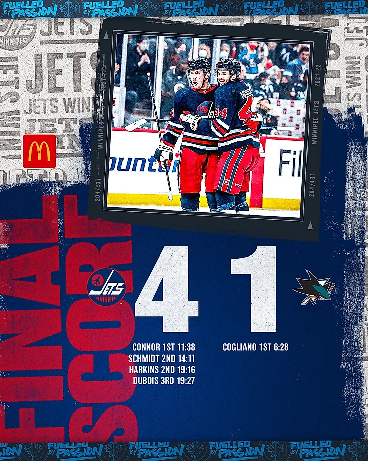 "Виннипег Джетс"-"Сан-Хосе Шаркс" 4:1.Пьер-Люк Дюбуа набрал 2 очка (1+1),Эндрю Копп отдал 2 результативные передачи,Евгений Свечников отдал результативную передачу,Коннор Хеллебайк отразил 26 бросков.Во втором периоде Адам Лоури подрался с Джонахом Гаджовичем.
