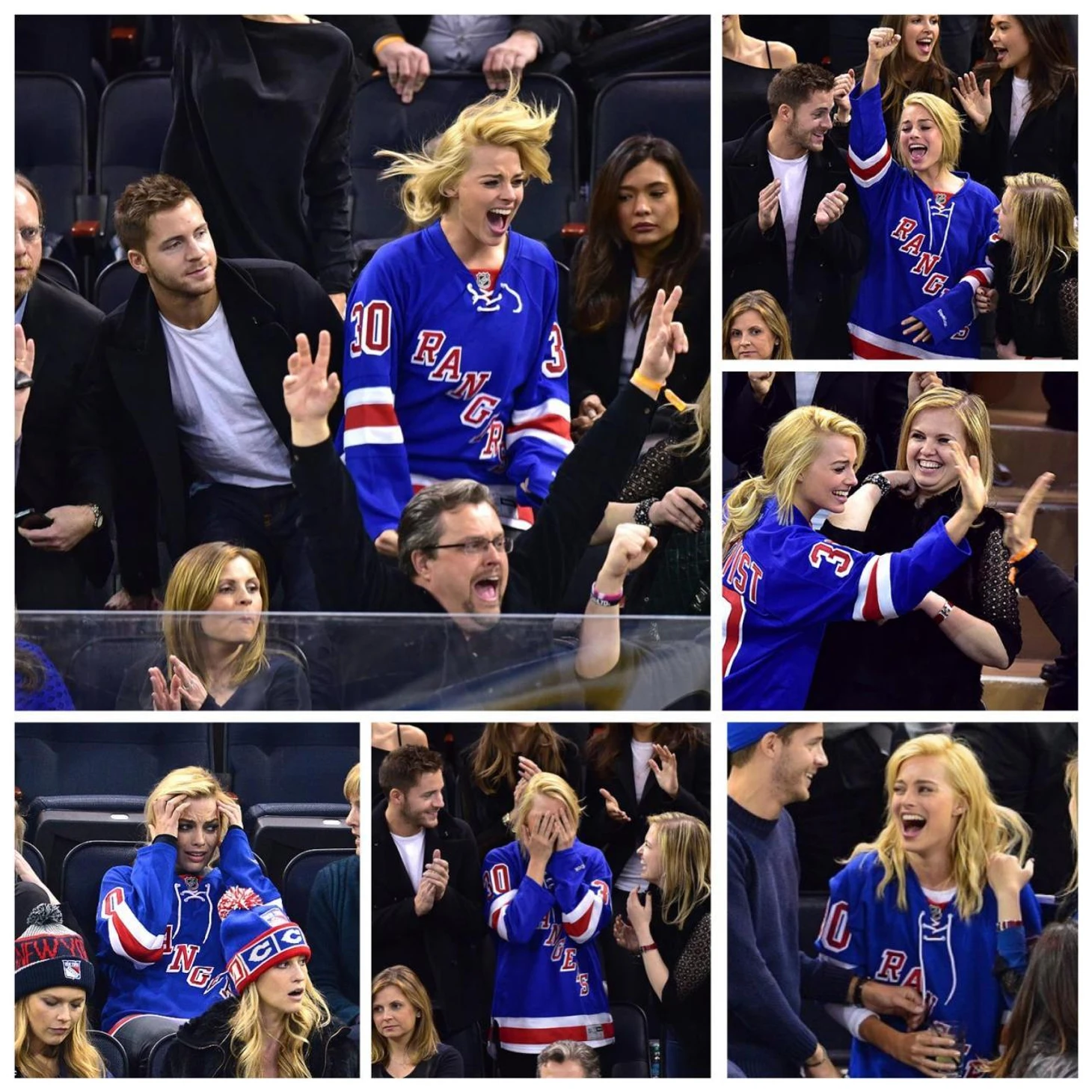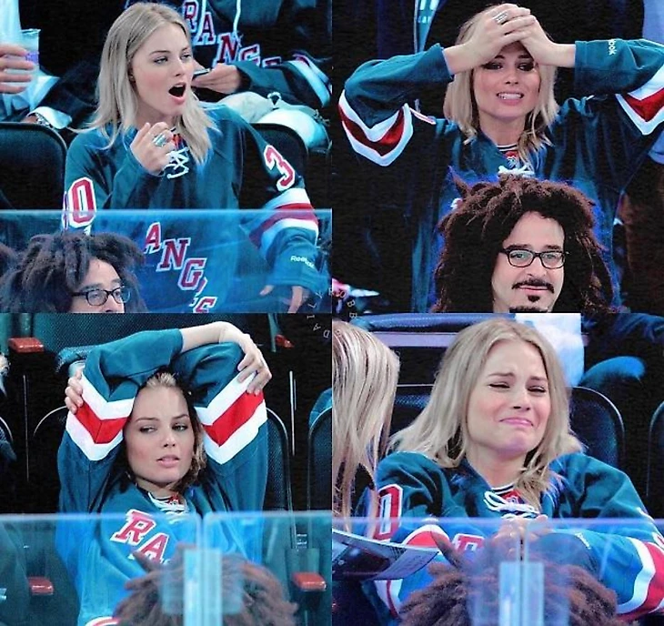 Известная голливудская актриса Марго Робби впервые покорила сердца хоккейных фанатов по всему миру своей искренней реакцией на матче «Нью-Йорк Рейнджерс» - «Коламбус Блю Джекетс» в декабре 2013 года!