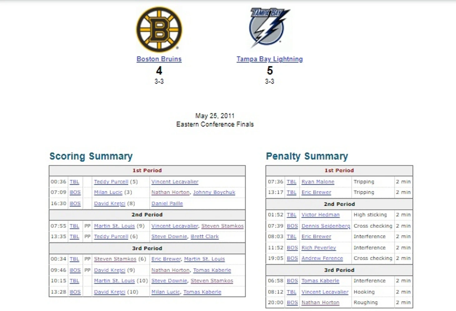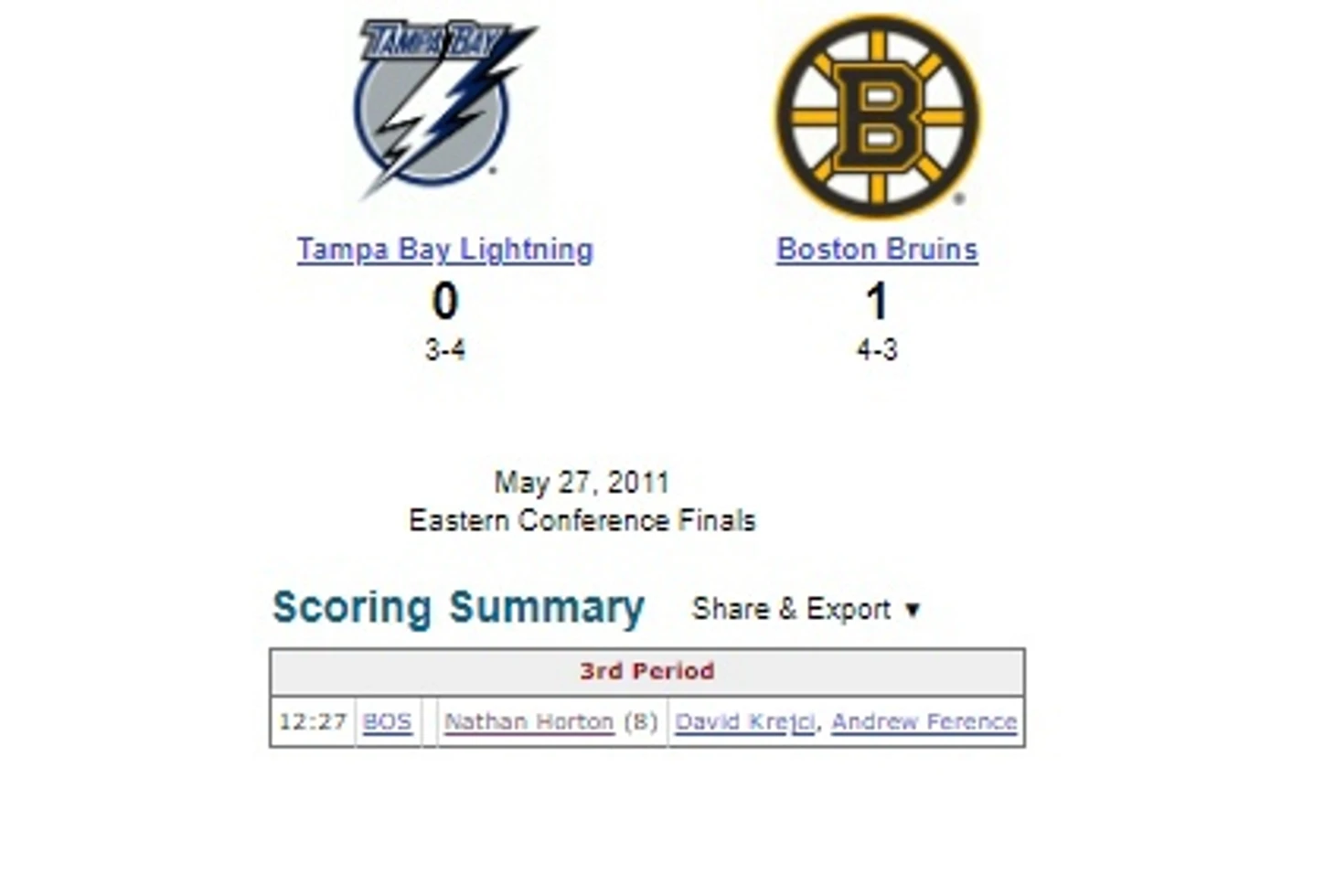 Чья шайба вывела Бостон в финал? Ну и на всякий случай ни одного удаления в решающей игре полуфинала. Весь плей-офф в большинстве Бостон не блистал (чуть 10% эффективности), а вот Тампа могла и наказать. Собственно, в 6-м матче она и сравняла счёт в серии благодаря тому, что реализовала первые 3 удаления Бостона.