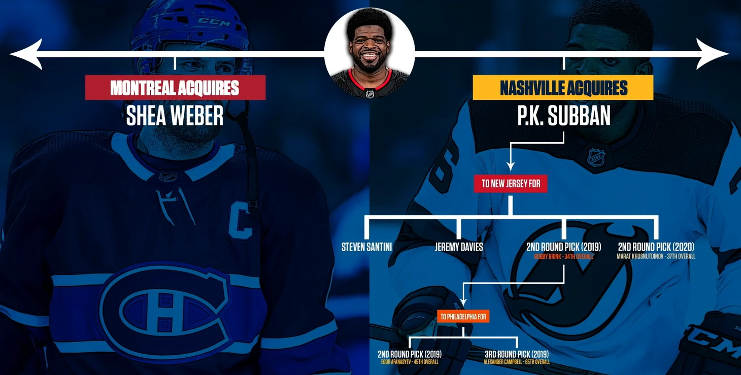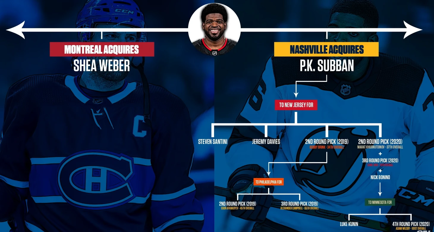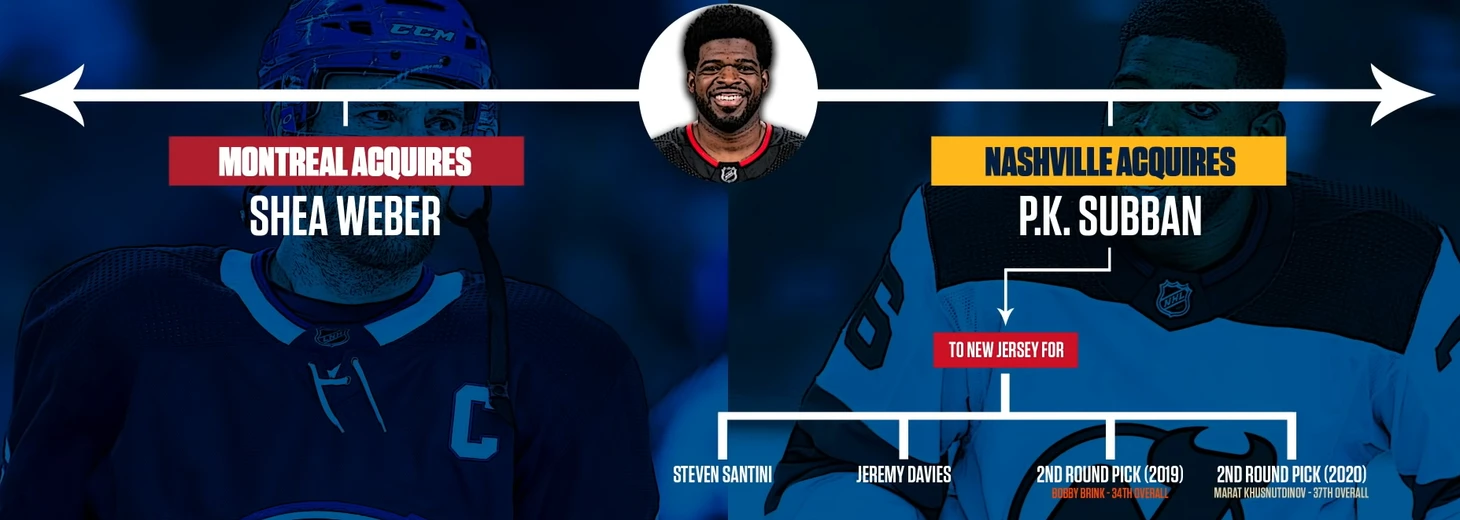 29 июня 2016 года поистине стало одним из самых необычных дней в истории современного рынка переходов Национальной Хоккейной Лиги. Такое ощущение, что клубы буквально сговорились, один за другим объявляя сенсационные обмены или же просто громкие новости. Как, например, переподписание Стивена Стэмкоса c "Тампой" на 8 лет и 68 миллионов. А ведь был ещё обмен Тэйлора Холла из "Эдмонтона" в "Нью-Джерси", где он впоследствии возьмёт Харт Трофи. Ну и конечно же настоящий блокбастер между "Монреалем" и "Нэшвиллом" по обмену ведущих праворуких защитников в НХЛ. Все эти сделки были объявлены с разницей буквально в полчаса, и мы хотим остановиться на последней. Сегодня, спустя 5 лет, рассмотрим обмен Пи-Кея Суббана на Ши Уэбера. Если у вас все порядке с английским, можете посмотреть эту историю в оригинале, видео оставим ниже. Если же нет – предлагаем вам наше изложение на великом и могучем. Будет интересно!