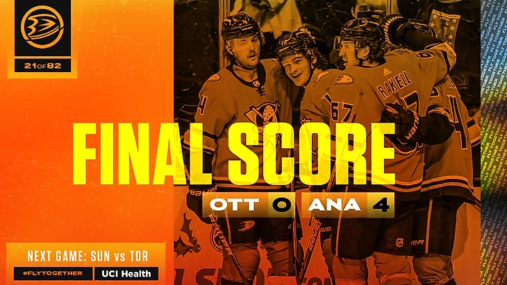 "Анахайм Дакс"-"Оттава Сенаторз" 4:0.Рикард Ракелл набрал 2 очка (1+1),Тревор Зеграс отдал 2 результативные передачи,Энтони Столарз отразил 34 броска и сыграл первый сухой матч в сезоне.В начале матча Сэм Каррик подрался с Остином Уотсоном,во втором периоде Джош Мэсон подрался с Брэди Ткачуком."Утки" прервали серию из 3 поражений подряд.