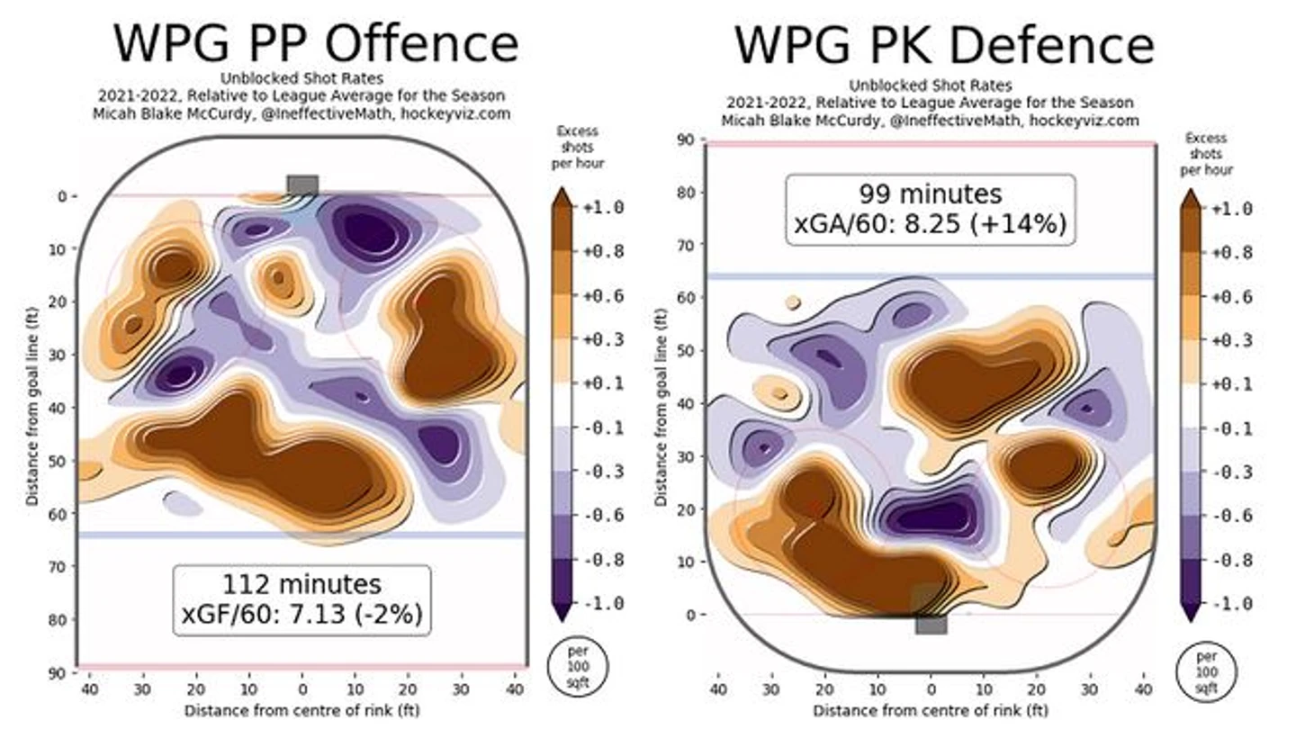 Минус – игра в неравных составах. В своей прошлой записи я рассказывал о том, что в игре «Виннипега» в равных составах намечаются положительные сдвиги, которых не было заметно вот уже несколько лет. «Джетс» становятся более стабильной командой при игре 5-на-5 во всех зонах, но для того, чтобы добиваться успеха в НХЛ одной только игры в равных составах недостаточно. Нужно еще, чтобы и спецбригады работали как надо, и по этой части у «Виннипега» есть очень большие проблемы. «Джетс» занимают предпоследнее место в лиге по эффективности игры в меньшинстве – 68,9%. То есть примерно каждое третье удаление реализуется соперниками команды из Манитобы. Это усугубляется еще и тем, что в этом сезоне «Виннипег» играет куда менее дисциплинированно. Если раньше «Джетс» фолили почти меньше всех в лиге, то сейчас находятся по этому показателю где-то в серединке.
