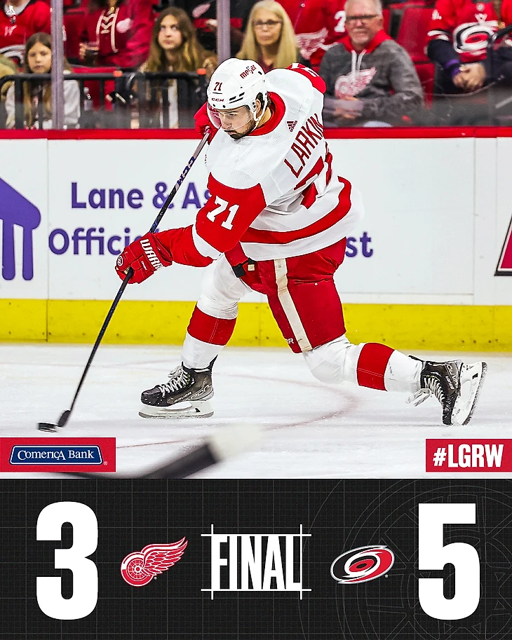 "Каролина Харрикейнз"-"Детройт Ред Уингз" 5:3.Нино Нидеррайтер забросил 2 шайбы,Йеспер Фаст,Теуво Теравайнен с Йеспери Котканиеми и Мартином Нечасом отдали по 2 результативные передачи,Фредерик Андерсен отразил 23 броска.У гостей Дилан Ларкин набрал 2 очка (1+1).Лукас Рэймонд отдал 2 результативные передачи.