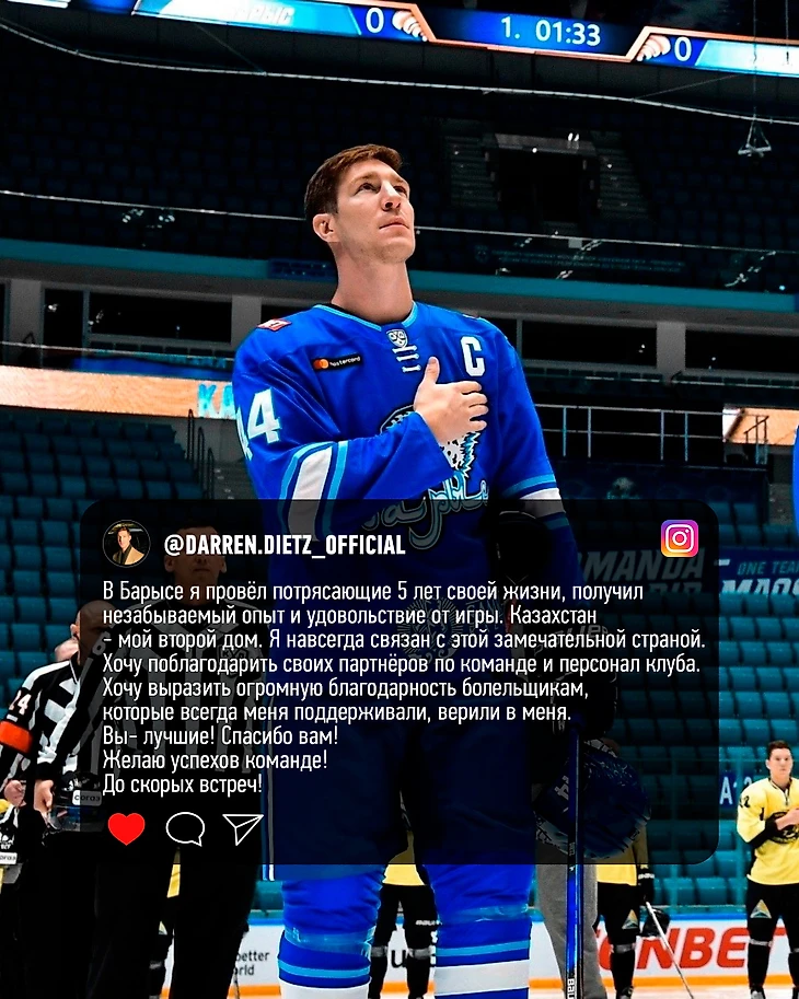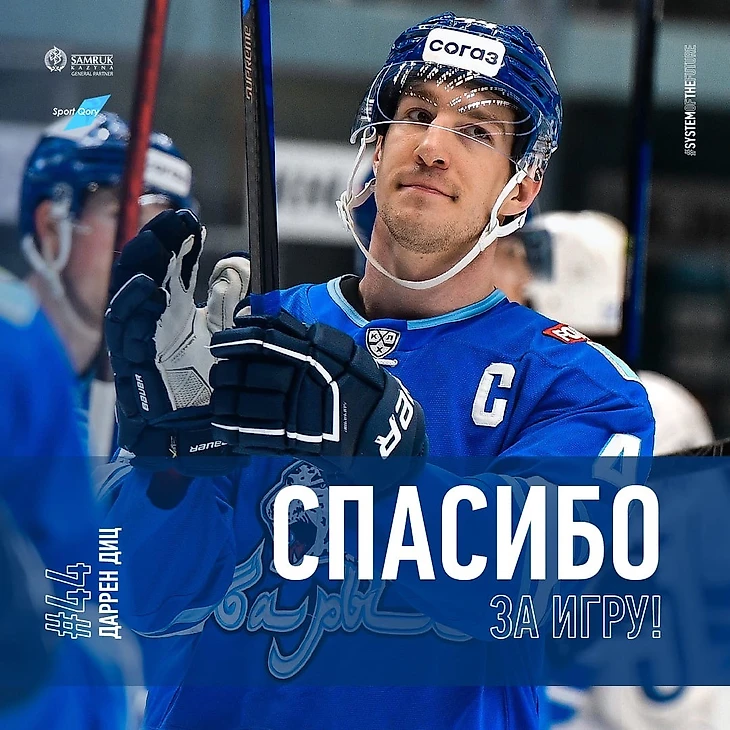Салют, друзья! Защитник «Барыса» и сборной Казахстана Даррен Диц перешёл в ЦСКА в обмен на денежную компенсацию. В текущем сезоне Диц набрал 21 (9 12) балл в 34 матчах регулярного чемпионата. Последние пять сезонов канадский хоккеист, выступающий за сборную Казахстана, провел в «Барысе». За этот период в КХЛ защитник набрал 174 (67 107) очка в 269 играх.