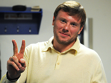 Дима - мой любимый игрок! У меня очень много картинок и есть даже фото где-то с ним:))) Когда мне грустно и одиноко, я всегда вспоминаю Рябыкина, его беспомощность на синей линии, потасовку с Петружалеком, завезение голов в ворота Рамо, удаление в 6-м матче с Нефтехимиком в прошлом году (когда мы чудом выстояли, а потом забили и вернули серию в Омск), кэповскую нашивку на то время пока был перелом мизинца у Калюжного. Иногда я так сильно ухожу назад, что даже вспоминаю 2003-2005 года, когда Дима еще не был христоматийным защитником-деревом, а был няшкой, который нравился всем девочкам)) В те года он даже капитанскую нашивку носил не просто так, а ПО-НАСТОЯЩЕМУ! Ох, Дима, герой моего тинейджерства! А сегодня он вернулся! Чмок-чмок-чмок:***
