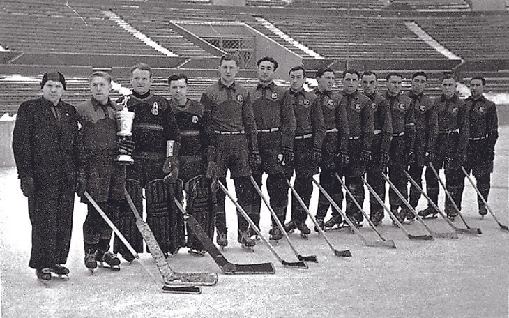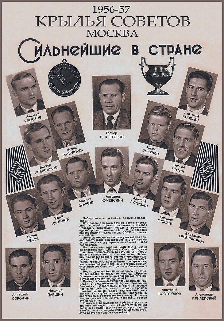 1951 год. «Крылья Советов» — первый обладатель Кубка СССР по хоккею с шайбой. Владимир Кузьмич Егоров (старший тренер), Сергей Митин (капитан), Борис Запрягаев, Василий Чепыжев, Алексей Гурышев, Альфред Кучевский, Анатолий Кострюков, Юрий Пантюхов, Михаил Бычков, Николай Хлыстов, Николай Нилов, Николай Паршин, Леонид Степанов, Валентин Захаров