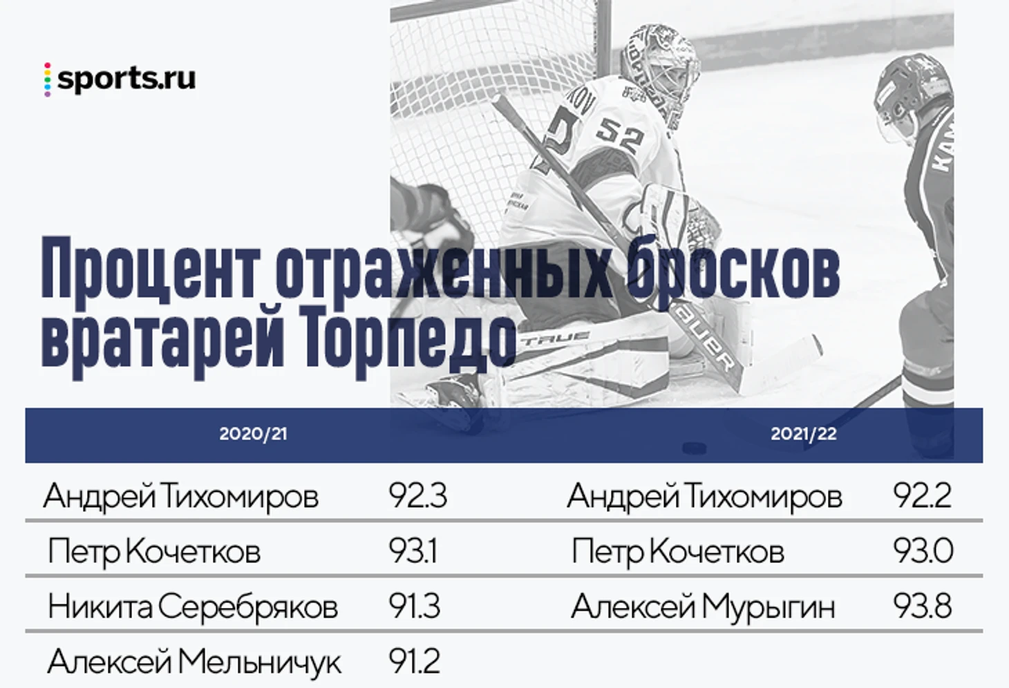 Петр Кочетков появился в «Торпедо» во время прошлогоднего дедлайна, заменив уехавшего в Северную Америку Мельничука. В конкурентной борьбе он переиграл Серебрякова – тот оказался третьим лишним. Летом Кочетков подписал контракт с «Каролиной», но остался еще на год в «Торпедо», продолжив играть вместе с Тихомировым. Как можно заметить, они показывают почти такую же статистику, что и в прошлой регулярке.