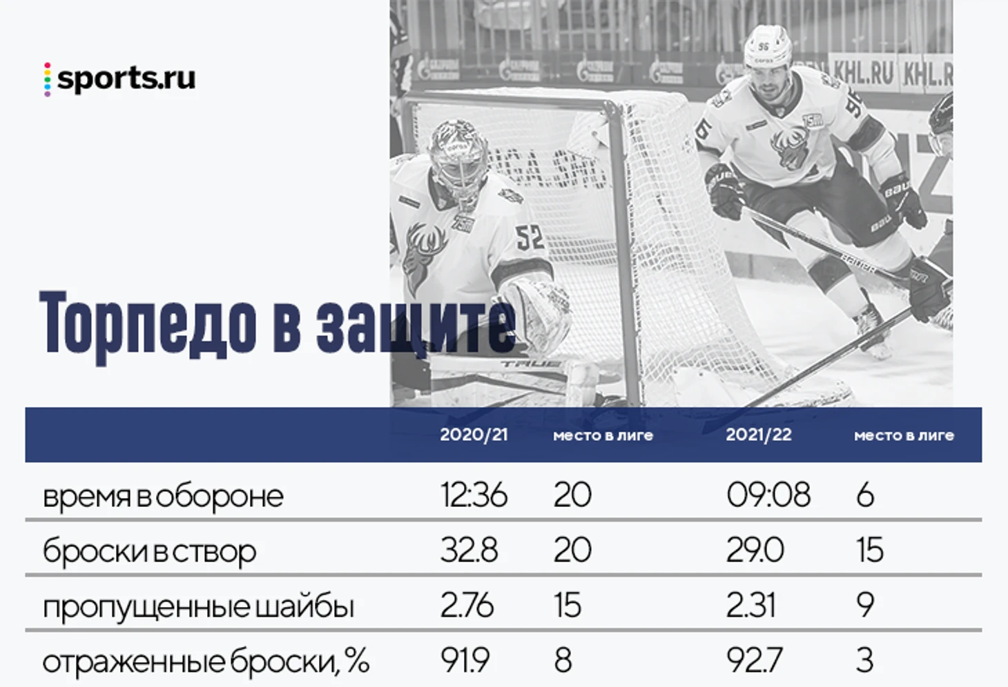 Кроме того, сейчас многие команды КХЛ (включая топов) все меньше играют в контроль, предпочитая действовать без шайбы и на контратаках. Для «Торпедо», делающего ставку на владение, это стало огромным плюсом. Больше играешь с шайбой – значит меньше атакует соперник, следовательно, меньше угроз твоим воротам. Сама игра в защите от «Торпедо» далека от идеала, они все еще допускают много опасных моментов, но даже такой прогресс позволил запрыгнуть в десятку лучших команд по пропущенным голам.