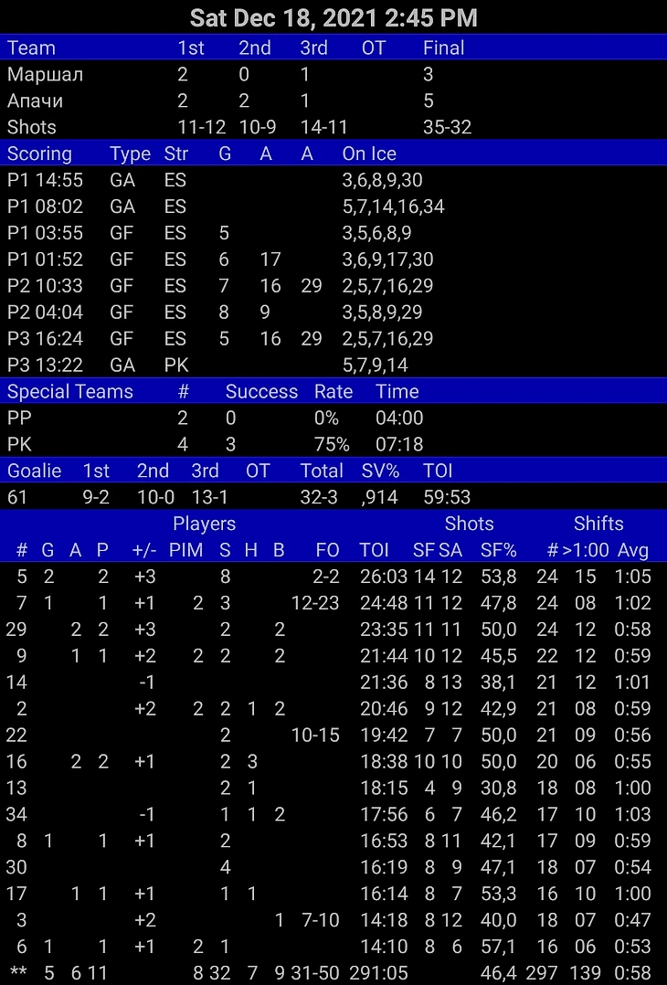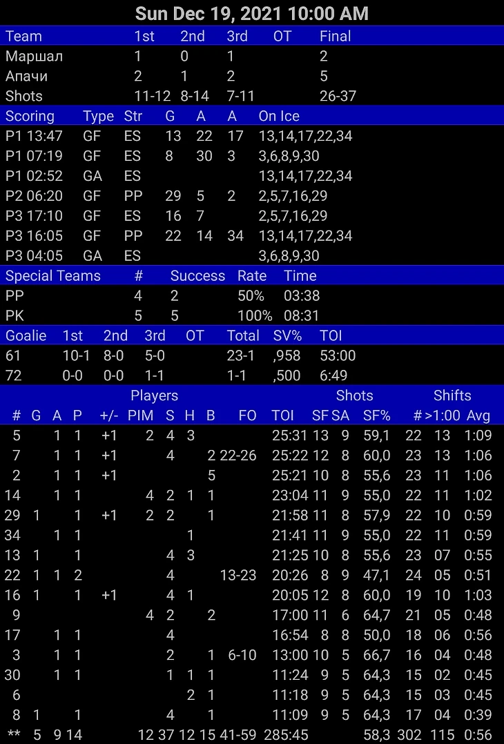 Тут же хозяева получают возможность поиграть в большинстве, и первую смену Апачи проводят в неплохой расстановке, однажды расписав отличную многоходовку, но Ремизов из правого круга вбрасывания всё никак не решится на бросок в касание, а его прострел низом замкнуть никто не смог. На исходе численного преимущества отличный момент для Крамарова создаёт Киракосян, но у Макара переиграть вратаря с близкого расстояния не получается.