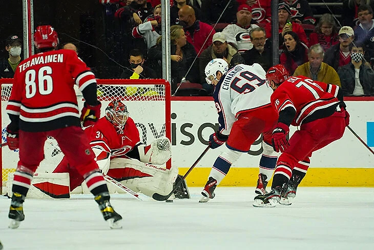 Второй гол – вообще красота. У «Коламбуса» не получилась позиционная атака, но они продолжали владеть шайбой на синей линии «Каролины» – наброс, рикошет от хоккеиста – и у Чинахова свободный коридор до ворот.