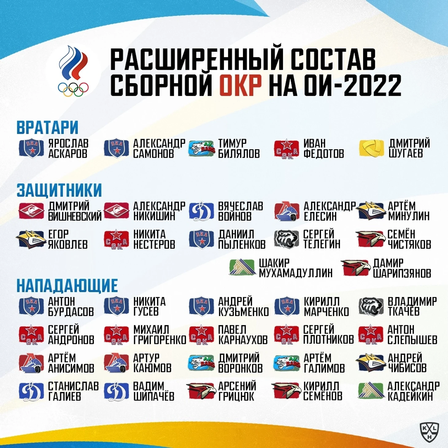 Вызов получили Ярослав Аскаров, Александр Самонов (оба – СКА), Тимур Билялов («Ак Барс»), Иван Федотов (ЦСКА), Дмитрий Шугаев («Северсталь»)