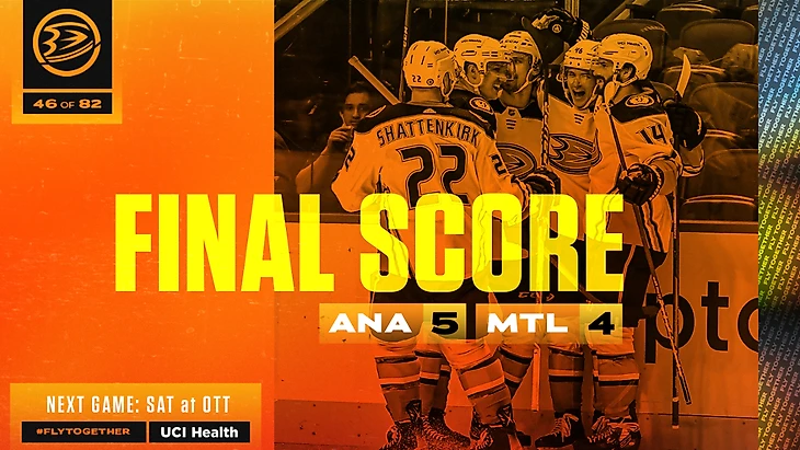 "Монреаль Канадиенс"-"Анахайм Дакс" 4:5.Трой Терри набрал 3 очка (1+2),Тревор Зеграс забросил 2 шайбы,Кэм Фаулер набрал 2 очка (1+1),Кевин Шаттенкирк отдал 2 результативные передачи,Энтони Столарз отразил 29 бросков.У хозяев Джейк Эванс забросил 2 шайбы,Рэм Питлик отдал 2 результативные передачи.