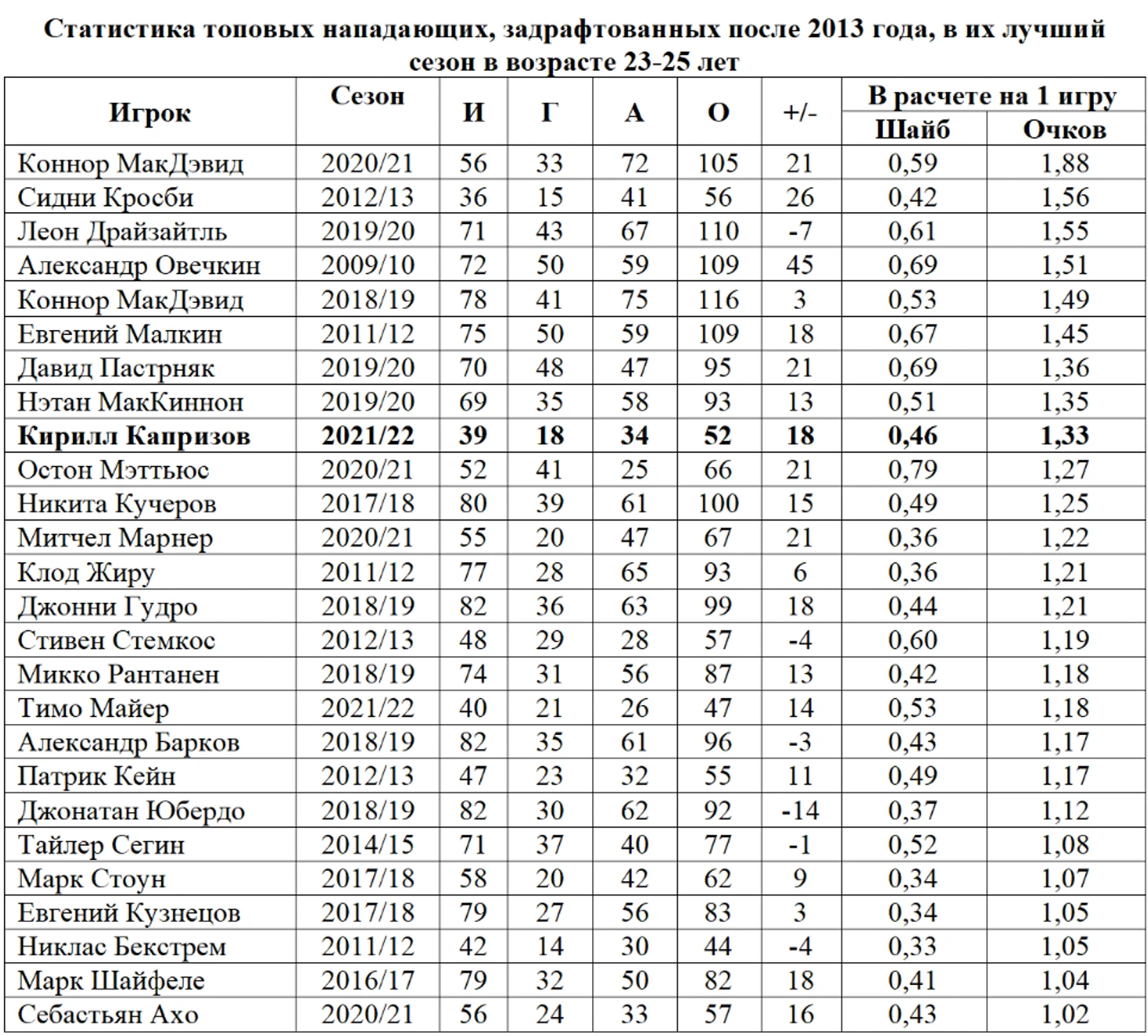 Таким образом, Капризов по результатам можно причислить не просто к топам лиги, но даже на статус звезды. При этом в данных сравнениях есть одно «НО» - возраст. Капризов уже сформировавшийся игрок и его прогресс будет в большей степени определяться адаптацией к лиге, чем с развитием собственных скиллов (пока результаты текущего сезона свидетельствуют об этом), тогда как у многих, запас больше только в силу этого фактора. Маккиннон, Барков, Юбердо стали полноценными звездами первого плана всей лиги в возрасте Капризова, хотя второй сезон у них был откровенно слабый. Что же говорить о МакДэвиде, Мэттьюсе, Драйзайтле, у которых были топовые результаты уже во втором сезоне в их возрасте. Поэтому попробуем оценить показатели Кирилла на фоне лучших сезонов звезд лиги в возрасте 23-25 лет, имеющих активный статус и сейчас. Постарался показать всех, набиравших более очка за игру, но может кого и забыл – с радостью воспользуюсь напоминанием!