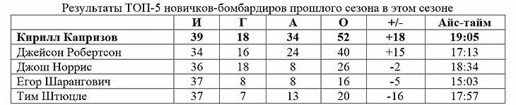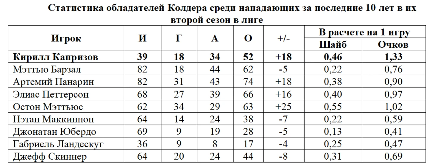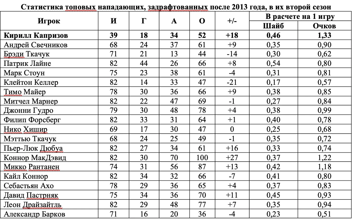 Если взглянуть шире и рассмотреть результаты второго сезона среди всех топовых нападающих последних 10 лет, то опять же у Капризова показатель самый высокий по очкам за игру, выше даже показателя МакДэвида и Рантанена, тогда как все остальные не дотянули до «единицы». Да, «российский №97» даже при сложном старте идет по графику лучше, чем всеми признанный и раскрученный вундеркинд лиги, но ждать ли по итогам годам рубежа в 100?