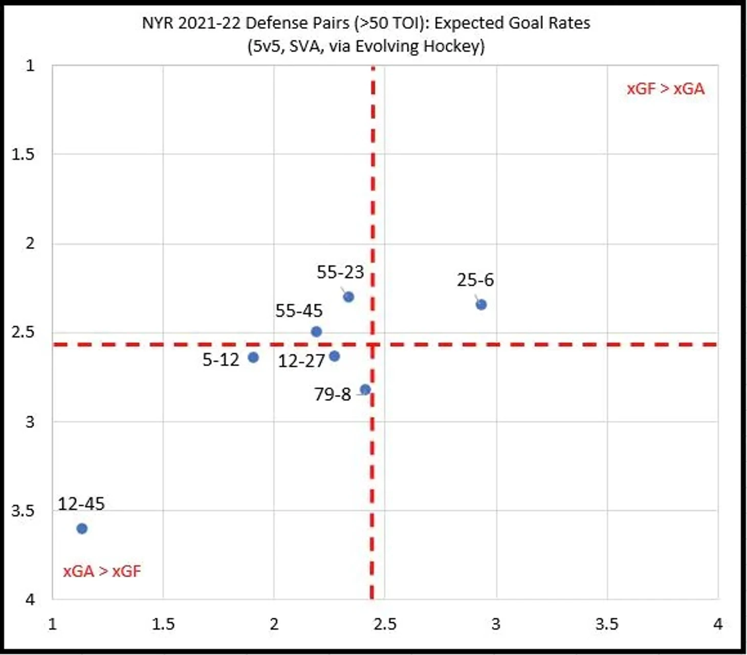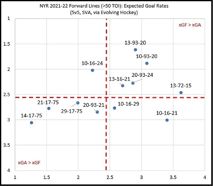 Уже 8е февраля. Рейнджерс находятся в зоне ПО, на втором месте в дивизионе Метро. Команде на пятки наступают Пенс, которые сейчас на 3м месте, и на 4м месте Капс, которые слегка сбавили обороты. На первом месте уверенно Кейнс, и они выглядят на сегодня неуязвимыми. Но главное не то что происходит с Пенс или с Капс, а то что команды, которые находятся ниже 4го места, как в Метро, так и в Атлантике не показывают признаков жизни. А это говорит о том, что Рейнджерс впервые за 4 года снова будут играть в ПО. Для Рейнджерс попадание в ПО значит впервые за те же 4 года, команда будет не продавцом, а покупателем до наступления дедлайна обменов в НХЛ, который наступит через полтора месяца - 21го марта. Вместе с тем навряд ли команда будет покупать дорого - причина проста: эта команда ещё не является достаточно хорошей командой, и чтобы поменять тенденцию Рейнджерс нужны драматические изменения. Посмотрите на графики ниже. Это графики, которые показывают насколько линии команды хороши в игре 5 на 5. Почему именно 5 на 5, потому что команды чем ближе к ПО и в самом ПО закручивают гайки, команды играют дисциплинированнее как в обороне, так и с точки зрения аккуратности в своих действиях. Заработать 2 минуты в большинстве становится сложнее, и забивать 5 на 5 становится сложнее. И в игре 5 на5 команда идет лишь на 22м месте в лиге (здесь вы можете ознакомиться со статистикой на момент экватора сезона). Форварды:
