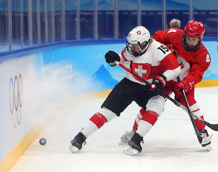 В Пекине-2022 Россия провела со Швейцарией первый матч группового этапа – 5:2. Команды по два раза обменивались голами, после чего сборная России забросила три безответные шайбы. Нападающий «Динамо-Невы» Полина Болгарева оформила хет-трик – второй для сборной России на Олимпийских играх (в Турине-2006 Лариса Мишина забросила три шайбы в ворота Швейцарии).