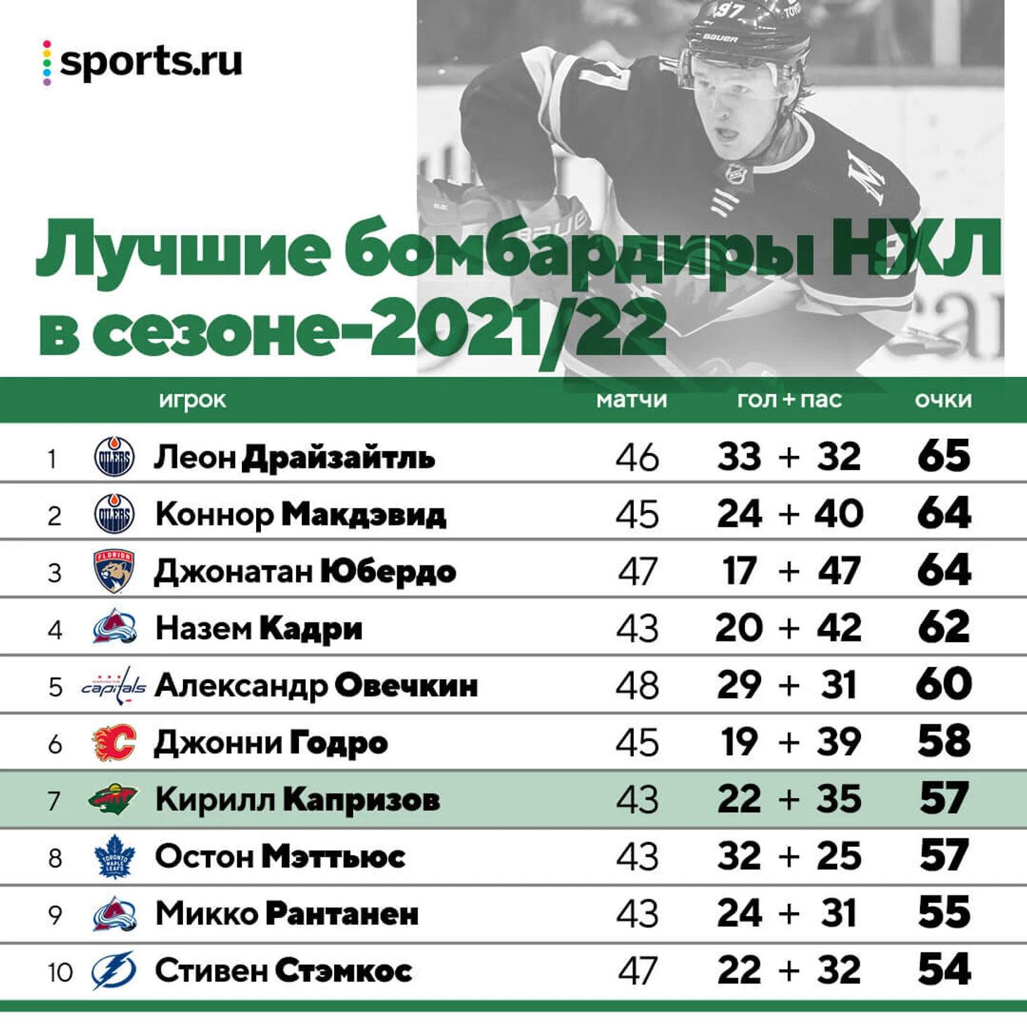 У Капризова – 12 голов и 25 очков в последних 15 играх, он здорово прибавил, хотя и до этого выглядел мощно. Он второй русский бомбардир сезона – и скоро может обойти главную русскую звезду НХЛ и объекта своих пародий: