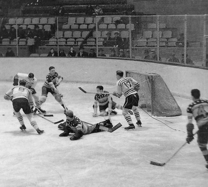Росс "Левша" Уилсон не был игроком НХЛ, он был помощником тренера. Я не знаю весь круг его обязанностей, но следить за экипировкой хоккеистов - была его прерогатива. В "Детройт", кстати говоря, Уилсон пришёл почти одновременно с Горди Хоу из команды младшей лиги "Омаха Найтс" в 1945 году, где Мистер Хоккей делал короткую остановку по пути в НХЛ, а "Лефти" - точил коньки. Так вот, кроме всего прочего, Россу вменялась ответственная должность "экстренного вратаря". На тренировках он старательно совершенствовал её, выходя против Хоу, Линдсея, Дельвеккио... И вот настаёт 10 октября 1953-го. "Ред Уингз" играют с "Канадиенс" в монреальском "Форуме" (вот уж этот монреальский "Форум" - поляна для экстренных выходов). В третьем периоде Морис "Ракета" Ришар врезался в Терри Савчака. Савчак игру продолжить не смог. Левша занял место в сети. Он отразил все броски по своим воротам, но на момент его выхода счёт уже был 4:1 в пользу "Монреаля", игра так и закончилась. Второе появление Уилсона в воротах состоялось 22 января 1956-го. В тот день "Детройт" принимал в "Олимпии-Детройт" "Торонто Мэйпл Ливс". Примерно за 13 минут до окончания матча травму получил вратарь "Торонто" Гарри Ламли и покинул площадку. Левша, в форме "Ливс", вышел против своих одноклубников. И вновь он занял место в воротах команды, которая на тот момент "горела" 1:4, и вновь он не пропустил, но поражения не избежал, матч вновь так и закончился - 1:4. Причём один из моментов с участием Лефти Уилсона вызвала бурные, но весёлые обсуждения. "Торонто", в надежде сравнять счёт, давили, в какой-то момент "Крылья" вырвались в контратаку, на ударную позицию вывели Марти Павелича, брос... Броска не последовало, ворот не оказалось на месте. Никто не видел, что именно Росс "сорвал сеть с якорей", но, конечно, он был подозреваемым №1. После игры Павелич со смехом говорил Маршаллу Данну из Detroit Free Press: "Я отлично знаю этого плута Лефти, это его рук дело." Момент манипуляции Росса воротами и попал на фото, приведённого выше. Кстати, на фото видно, что Уилсон праворукий, т.е. - "Левша" - абсолютное прозвище - без вариантов. И, наконец, третье явление Лефти Уилсона в образе вратаря состоялось 29 декабря 1957-го и вновь в детройтской "Олимпии". На этот раз Левше предстояло отыграть, без малого, матч целиком. И вновь ему выпало сыграть против своих товарищей по команде. На девятой минуте матча с "Бостон Брюинз" травму получил вратарь "косолапых" Дон Симмонс. Один из тренеров "Брюинз" - Хэмми Мур - сам в прошлом вратарь, и предполагалось, что именно он займёт место в воротах. Однако, посовещавшись, "политсовет" "Бостона" решил прибегнуть к "услугам профессионала". В этой игре Уилсона всё-таки пробили. 1 раз. Причём, сделал это не кто-то из звёздной атаки "Ред Уингз", а защитник Джек МакИнтайр. А матч закончился вничью - 2:2. "Мишки" были тронуты бескомпромиссным поведением Левши, блестяще отыгравшего против своих партнёров, не дав повода усомниться в своей непредвзятости. Генеральный менеджер бостонцев Уолтер Браун вручил Уилсону 150 долларов и наградил наручными часами. Ту встречу, вот ещё "зигзаг судьбы", обслуживал арбитр Ред Стори, с которым у Лефти, за несколько лет до этого, во время одного из матчей, возникли нездоровые "тёрки". Якобы, Росс Уилсон, во время матча в "Мэйпл Ливс Гарден" выкрикивал оскорбления в адрес Стори. На Левшу была накалякана бумага "куда следует" и 
