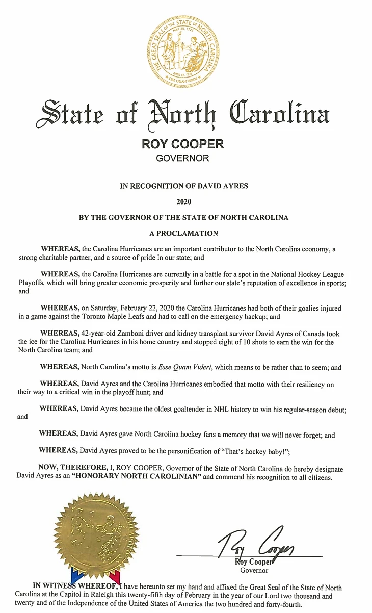 22 февраля исполнилось ровно 2 года с момента дебюта в Лиге парня, вошедшего в историю под прозвищем "Гонщик на "Замбони". Я уверен, 2 года - это то, что было вчера, и Вы, конечно же, помните ту историю. Но, на всякий случай, немного освежу память, да и вдруг(?!) у меня появились юные читатели))). В НХЛ, на каждом матче присутствует "теневая должность", именуемая - "экстренный вратарь". Это непереодеваемый человек, находящийся на стадионе, очень часто среди зрителей, и готовый в любую минуту перетянуть на себя свет всех юпитеров. Произойдёт это в том случае, если оба вратаря одной из команд получат травмы и не смогут продолжить игру. Вот тогда и настаёт звёздный час того самого парня. Подобные случаи крайне редки, но они, и мы с Вами тому свидетели, иногда происходят. Работник "Скотибанк Арены", в Торонто, заливщик льда, был тем самым "экстренным вратарём" на матче "Торонто Мэйпл Ливс" - "Каролина Харрикейнз" 22 февраля 2020 года (да, надо полагать, и в других матчах на "Скотибанк Арене" тоже). После того, как оба вратаря "Каролины", Джеймс Раймер и Петр Мразек, получили травмы, пилот "Замбони" вступил в дело. Обратите внимание на фото - свитер у него "ураганный", а вот вратарская экипировка с символикой "Листьев" - хозяева снабдили. В Канаде, поверьте мне на слово, этого "гонщика" запомнили надолго. Ведь он отразил 8 из 10 бросков по своим воротам и остановил супер-звёздный "Торонто" с Мэттьюзом, Марнером, Таваресом, Нюландером... Счёт 6:3 в пользу "Каролины". Дэвиду подарили игровой комплект формы, заплатили 500 баксов (не знаю, правда, кто?), заключили несколько долгосрочных рекламных контрактов (уже далеко не на "пятихатку бакарей"), выдали вот такую бумагу.