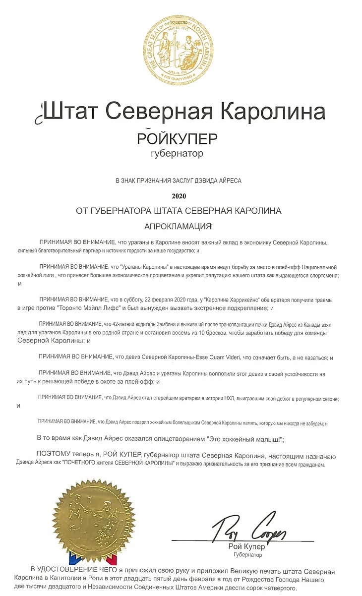 Почётный гражданин Северной Каролины. То-то. Значит ещё в троллейбусах, автобусах и прочем общественном транспорте этого штата можно будет со скидкой ездить, если с "Замбони", вдруг, что не так.