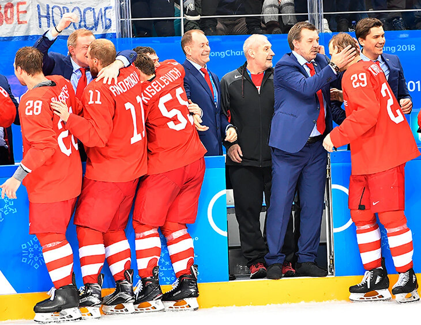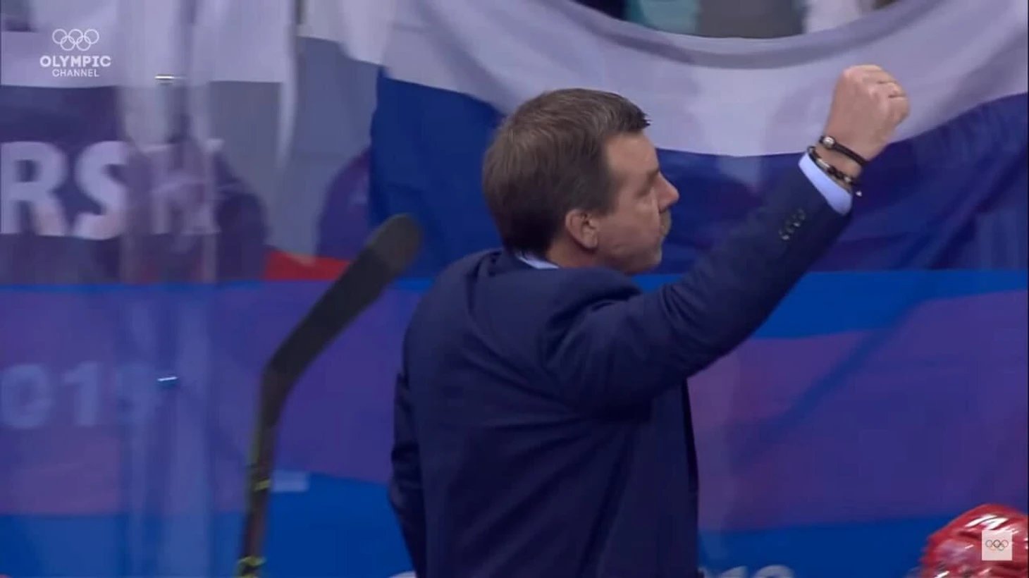 На скамейке России начался праздник, а Олег Знарок прошелся перед трибунами с победно поднятой рукой.