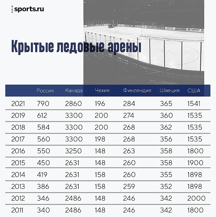 Мы решили проверить, как изменилось соотношение катков, собрав данные из отчетов ИИХФ за последние 10 лет. Учитывали только крытые, потому что не очень понятно, что ИИХФ считает открытым катком, и как ведется подсчет. Кроме того, сейчас вряд ли можно вырастить серьезного игрока на открытом льду, речь скорее про базовые навыки и воспитание любви к виду спорта.