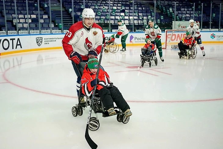 В рамках «Турнира на паузе», в свободный от игр день, в спортивном комплексе «Татнефть Арена» состоялся седьмой благотворительный матч «Хоккей каждому». Такие игры уже стали доброй традицией в Казани – проект реализуется с 2018 года, за это время в нём приняли участие более 100 детей с нарушениями опорно-двигательного аппарата. В нынешнем матче приняли участие команды «Вымпел» и «Метеор» из двадцати девочек и мальчиков, сыгравших в хоккей на колясках. Помощниками юных игроков стали мэр Казани Ильсур Метшин, олимпийский чемпион по хоккею Сергей Шепелев, игроки Ночной хоккейной лиги, руководители и игроки команд КХЛ. Встреча завершилась ничейным результатом – 7:7, а после игры дети-хоккеисты получили памятные подарки. Также стоит сказать, что в 2019-м году проект «Хоккей каждому» был отмечен наградой премии «Event-прорыв» в Нижнем Новгороде и стал победителем в номинации «Лучший социальный проект».