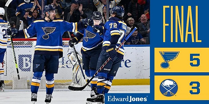 "Сент-Луис Блюз"-"Буффало Сэйбрз" 5:3.Джордан Киру набрал 3 очка (2+1),Иван Барбашев отдал 3 результативные передачи,Джастин Фолк отдал 2 результативные передачи,Вилле Хуссо отразил 35 бросков.У гостей Кайл Окпосо и Дилан Козенс набрали по 2 очка (1+1)."Блюзмены" выиграли 3 игру подряд.